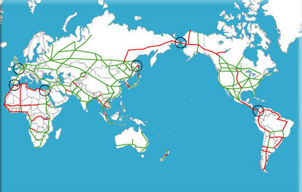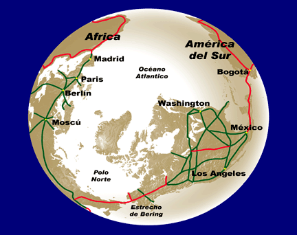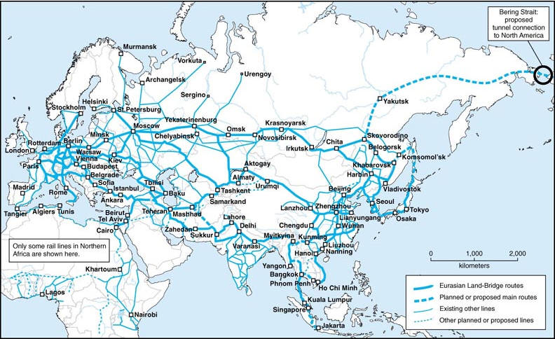 Вид на железнодорожные пути мира со стороны Северного Полюса, показывающие значимость их соединения тоннелем под Беринговым проливом.
