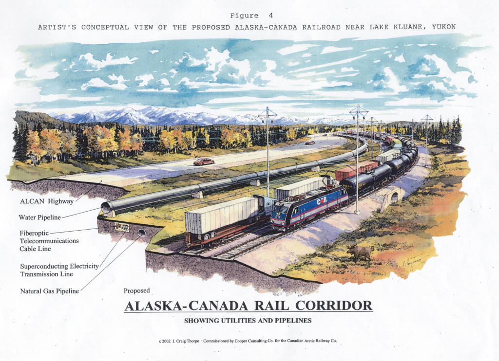 Железнодорожный коридор Аляска-Канада, показывающий коммуникации и трубопроводы.