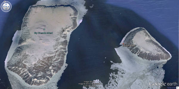 Остров Крузенштерна, или остров Малый Диомид, США (слева), и остров Ратманова, или остров Большой Диомид, Россия (справа), расположенные в центре Берингова пролива.