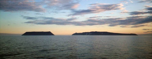Остров Крузенштерна, или остров Малый Диомид, США (слева), и остров Ратманова, или остров Большой Диомид, Россия (справа), расположенные в центре Берингова пролива. Вид со стороны Северного Ледовитого океана.