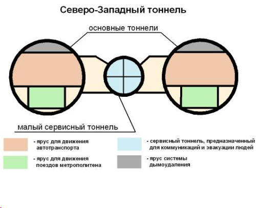 ![]() Се́веро-За́падный тонне́ль (Серебрянобо́рские тонне́ли) —двухярусный тоннель глубокого заложения на северо-западе Москвы , состоящий из трёх «ниток». Расположен под природоохранной зоной Серебряноборского лесничества , начинается в районе пересечения Крылатской и Осенней улиц и заканчивается в Троице-Лыково . Тоннель является частью Краснопресненского проспекта , открыт 27 декабря 2007 года . Нижний ярус тоннеля предназначен для движения поездов Арбатско-Покровской линии Московского метрополитена , верхний — для автотранспорта. В верхнем своде тоннеля размещаются металлические короба вентиляции и дымоудаления . Для коммуникаций и эвакуации людей между основными тоннелями сооружён малый сервисный тоннель диаметром 6,2 м, соединённый межтоннельными эвакуационными сбойками . Тоннель оборудован современными автоматическими системами диспетчеризации , видеонаблюдения , газоанализа , пожаротушения , газоочистки , радарного контроля скорости движения. Автотранспортный уровень тоннелей имеет три полосы для движения автотранспорта и две служебные пешеходные банкетки: крайние левые полосы шириной 3,25 метра и габаритом 4,2 метра, для движения легковых автомобилей, средняя и крайняя правая полоса шириной 3,5 метра и габаритом 4,5 метра, для движения остальных транспортных средств. Длина основных тоннелей — 3126 метров, включая рамповую часть длиной 360 м. Диаметр тоннелей 13,75 метров. Максимальная глубина залегания 44 метра. Первый и второй тоннели строились проходческим щитом Правительства Москвы производства фирмы Herrenknecht весом 150 тонн и диаметром 14,2 метра. Общая протяжённость работ проходческим щитом при прокладке каждого тоннеля 3010 метров. Генеральный подрядчик строительства — Мосметрострой, заказчик ООО «Организатор», проектировщик ОАО «Метрогипротранс», головные подрядчики «Тоннель-2001», СМУ-1 Метростроя, СМУ-3 Метростроя. Цена объекта, включающего также Живописный мост, дороги, подземные пешеходные переходы, здания и коммуникации, — более 36 млрд рублей (1,2 миллиарда долларов). Источник.