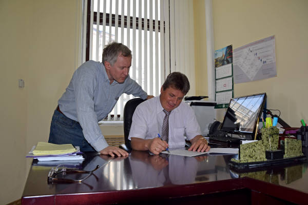 Fyodor Soloview, Director of InterBering, LLC (standing) taking part in discussion of the Russia-US railway construction project with the Deputy Head of Technical Policy of JSCo "Russian Railways" Viktor Alferov on August 15, 2014.