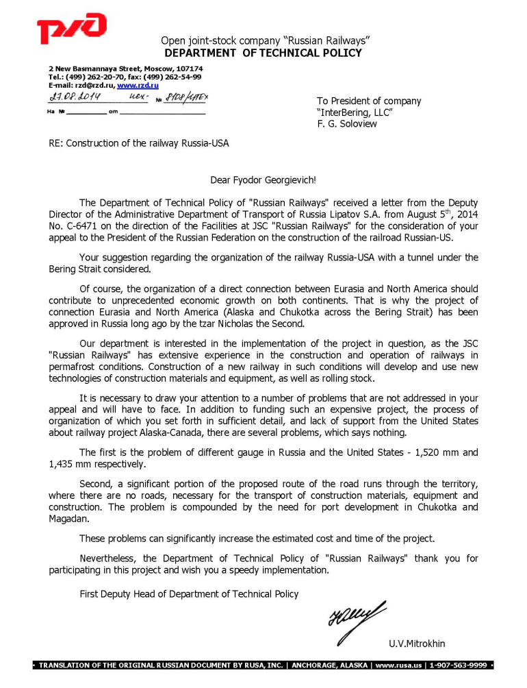 to Fyodor Soloview, President InterBering, LLC. August 27, 2014 Original letter, in Russian (PDF). Translation to English (PDF).